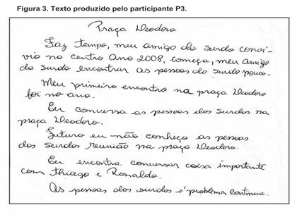 P3: Relata em seu texto sobre o início e o desenrolar de seus contatos com outros surdos que se reuniam em uma praça. Ele viu nesses encontros a oportunidade de interagir com outros surdos e aprender a “mímica” (Libras). O texto de P3 está ilustrado na Figura 3.