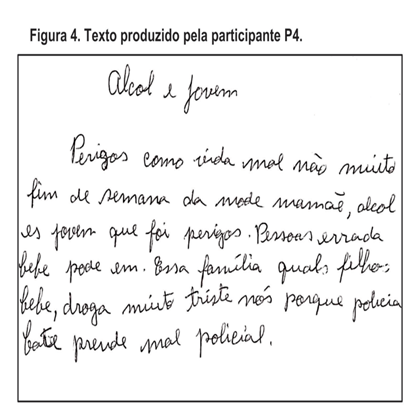 P4: O estudante passou a trabalhar com mais intensidade com a produção e interpretação de textos que tivessem pequenos trechos apresentados a ele. Sua produção está exposta na Figura 4, a seguir.
