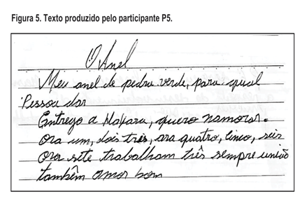 P5: Relata a entrega de um anel a uma pessoa, que, conforme o narrador, trabalhou muito para adquiri-lo (Figura 5).