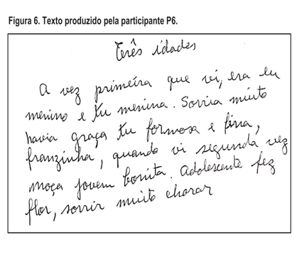 Destaca-se na análise do texto de P6 a ausência de conectivos e de artigos indefinidos. Há inversão de “primeira vez” para “vez primeira”. Observa-se a ausência do verbo "ser" em vários trechos. No último enunciado, o tempo verbal está impreciso com o uso dos verbos no infinitivo ("sorrir"; “chorar”). Apesar do arranjo incomum da sequência dos termos correspondentes à língua portuguesa, é possível identificar protagonistas (“menino”, “menina”, “adolescentes”). O texto permite compor um encadeamento parcial do sentido. Destaca-se o uso de adjetivos, como: “tu formosa e fina, franzinha”; “moça jovem bonita”.