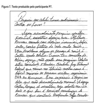 P7: O texto abaixo é o rascunho de P7, escrito na prova de redação do ENEM, cuja temática de pesquisa correspondia às células-tronco (Figura 7).