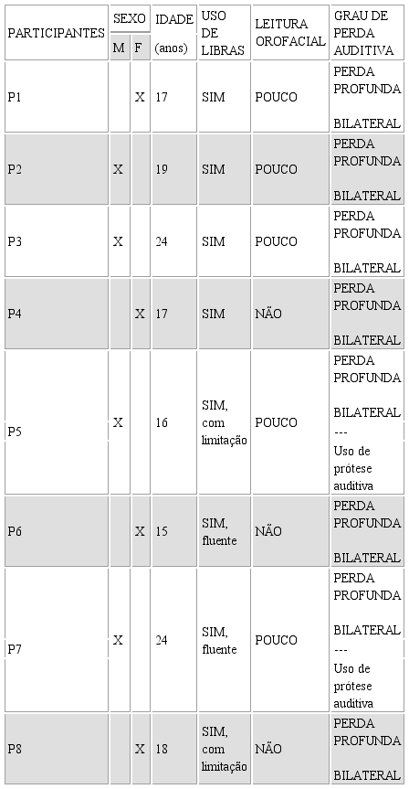 O estudo mostrou que alguns participantes (P4, P5, P6 e P8) necessitam de intervenções mais intensas na escrita de língua portuguesa, centradas nas especificidades da língua de sinais e na utilização de recursos visuais, pois o sentido do que escreveram em seus textos nem sempre esteve claro. Essa característica foi muito relevante para a nossa conclusão sobre o modo pelo qual o estudante surdo relaciona-se com a língua portuguesa, que é bem diferente da estrutura textual de um estudante ouvinte.