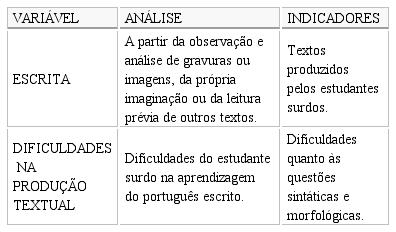 Para a coleta dos dados foram utilizadas as seguintes técnicas: i) questionários aplicados aos estudantes surdos; ii) análise documental da produção textual dos estudantes surdos, com produção de textos a partir de gravuras; i) entrevistas não estruturadas com a professora de língua portuguesa.