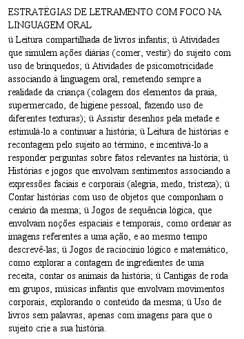 O trabalho com foco na modalidade oral faz com que o indivíduo com SD, compreenda que as palavras contêm significados e que elas devem ser empregadas de acordo com o contexto em que se insere, pensando no seu uso correto, desenvolvendo as práticas sociais de leitura e posteriormente da escrita.