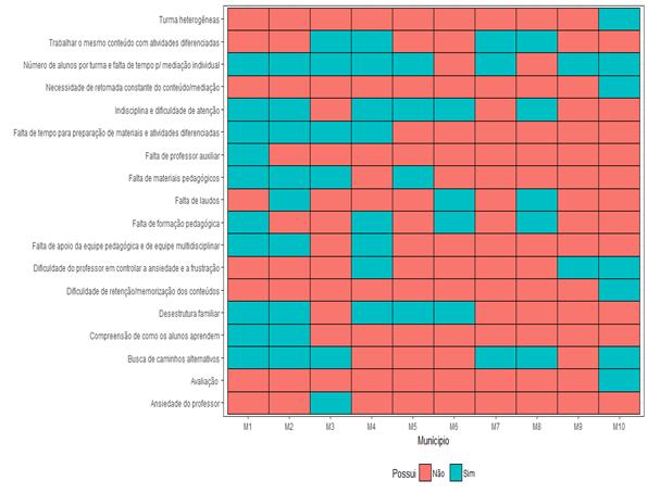 É necessário considerar que pensar em mediações diferenciadas e caminhos alternativos à aprendizagem exige um tempo maior de preparação, por meio de pesquisa, estudos e planejamento. Esta foi uma dificuldade apontada por quatro municípios (M1, M2, M3 e M4), evidenciando a preocupação e a consciência dos professores quanto a tal necessidade.