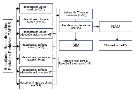 Resumen: Las personas con discapacidad ha sido tema de diversas discusiones en las más variadas áreas, ya que las Leyes que garantizan derechos y deberes a este público son recientes. Así, el objetivo de esta investigación fue realizar una revisión sistemática en bases de datos online que permitieron identificar, categorizar y analizar los trabajos ya realizados con alumnos sordos en la enseñanza de Química tras la creación de la Ley nº 10.436 en 2002. La búsqueda de los trabajos fue hecha en la base de datos Portal de Periódicos da CAPES a partir de la combinación de siete descriptores resultando finalmente en 8 trabajos pertinentes al tema. Después del análisis de los trabajos encontrados se observó que hay pocas investigaciones en el área, siendo necesario una mayor profundización de investigaciones en el área de enseñanza de química para sordos, así como conocimiento de la Libras por los profesionales del área de la educación.