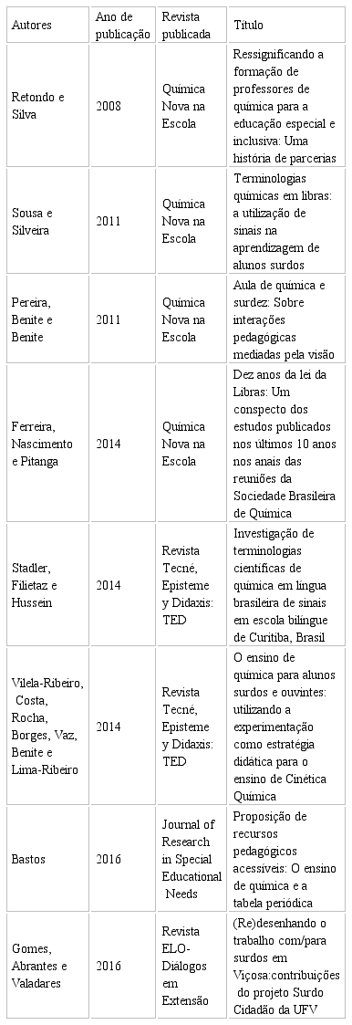 Com relação ao que os estudos propuseram, o trabalho “Dez anos da lei da Libras: Um conspecto dos estudos publicados nos últimos 10 anos nos anais das reuniões da Sociedade Brasileira de Química” apresentou uma pesquisa bibliográfica sobre ensino de química e surdez (FERREIRA; NASCIMENTO; PITANGA, 2014). A proposta do artigo visou a busca no endereço eletrônico dos anais das Reuniões Anuais da Sociedade Brasileira de Química (RASBQ) por resumos apresentados num intervalo de 10 anos a partir da publicação da Lei da Libras. Esta resultou em 11 resumos com a temática proposta, indicando a necessidade de mais estudos em áreas específicas. O mesmo foi notado pela presente revisão sistemática, pois também foram encontrados poucos artigos publicados que abordam o ensino de química e a surdez. Pode-se dizer que estes resumos apresentados no congresso apontam expansão e interesse em pesquisar e compreender a educação especial para surdos no campo da química, possibilitando avanços e novos estudos na área, entretanto, mostra também a ausência de profissionais da área da química e demais ciências naturais com formação para pesquisar/atuar na interface Química/Educação Especial.