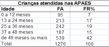 O atendimento em IP nas APAES do Estado de São Paulo é realizado em sua maioria com crianças entre zero e cinco anos e, 36% das crianças que passam pelo serviço tem entre 0 e 6 anos. Autores tem apontado a importância de a intervenção ocorrer já nos primeiros anos de vida para a obtenção de melhores resultados no desenvolvimento físico, cognitivo e emocional de crianças que manifestem algum tipo de alteração estrutural ou funcional (GURALNICK, 1998; GIFFORD-SMITH; BROWNELL, 2003; LAPA; ALMEIDA, 2015).