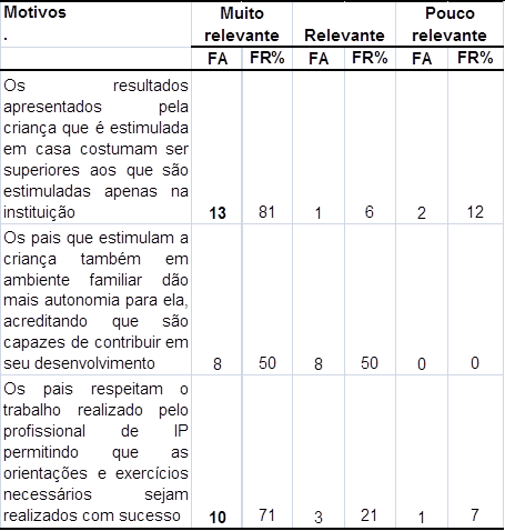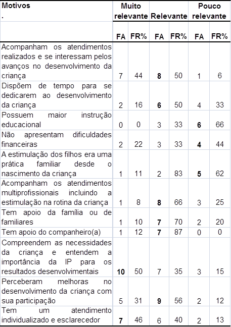 Nota-se, pela Tabela 3, que para os profissionais, o motivo mais relevante para que a família dê continuidade na IP é porque compreendem as necessidades apresentadas pela criança e entendem a importância da IP para a otimização de seus resultados desenvolvimentais. Outro motivo de muita relevância foi porque tem um atendimento individualizado e esclarecedor pelo profissional que atende a criança. Segundo os mesmos, um dos motivos relevantes, é porque acompanham todos ou grande parte dos atendimentos realizados, se interessam pelos avanços no desenvolvimento da criança e perceberam melhoras no desenvolvimento da criança com sua participação na estimulação precoce. Já os motivos pouco relevantes são o nível de instrução educacional, dificuldade financeira e acompanham os atendimentos multiprofissionais incluindo a estimulação na rotina da criança.