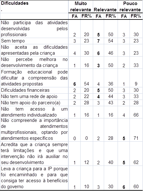 Observa-se pela Tabela 4 que uma das maiores dificuldades que implicam a continuidade da IP no ambiente familiar segundo os participantes é porque a mãe/família tem uma formação educacional que pode dificultar a compreensão das atividades propostas pelo profissional ou instituição. É visto como um dificultador relevante o fato da mãe/família não participar das atividades desenvolvidas pelos profissionais das APAES, por relatarem que as mães não têm tempo para realizar as atividades que são propostas para casa e porque parecem não aceitar as dificuldades apresentadas pela criança. Foi considerado pouco relevante o fato da mãe/família levar a criança para a estimulação precoce somente porque foi encaminhada e para que consiga ter acesso a benefícios do governo.
