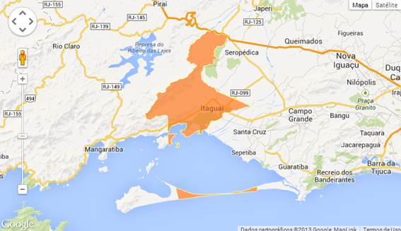 O município de Itaguaí, lócus desta pesquisa, pertence ao Estado do Rio de Janeiro, e se encontra na região denominada Costa Verde, mas é um município que pertence a Baixada Fluminense. De acordo com o IBGE (Instituto Brasileiro de Geografia e Estatística), no ano de 2012 a estimativa de sua população era de 113.182 pessoas. A região limita-se, a oeste, com os municípios do Rio de Janeiro e de Seropédica; ao norte faz divisa com Piraí e Paracambi; a leste com os municípios Rio Claro e de Mangaratiba. Sua área estende-se por aproximadamente 272 km², estando a uma altitude de 13 metros do nível do mar (PME- ITAGUAÍ, 2015-2025), como podemos observar no mapa abaixo: