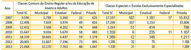 Mediante a atualização da Política, a educação especial no Estado, passa a ser concebida como “uma modalidade que perpassa todos os níveis, etapas e outras modalidades de ensino, sem substituí-los, ofertando os recursos e serviços de acessibilidade aos estudantes segundo o seu público.” (SANTA CATARINA, 2015, p.71). Considerando o caráter transversal da educação especial em todos os níveis e modalidades de ensino, cabe destacar que a inclusão de pessoas com deficiência nas classes comuns e na modalidade EJA em SC, está ocorrendo de maneira mais acentuada nos últimos anos, como consequência da ampliação do acesso ao ensino regular. Os dados são apresentados na figura abaixo.