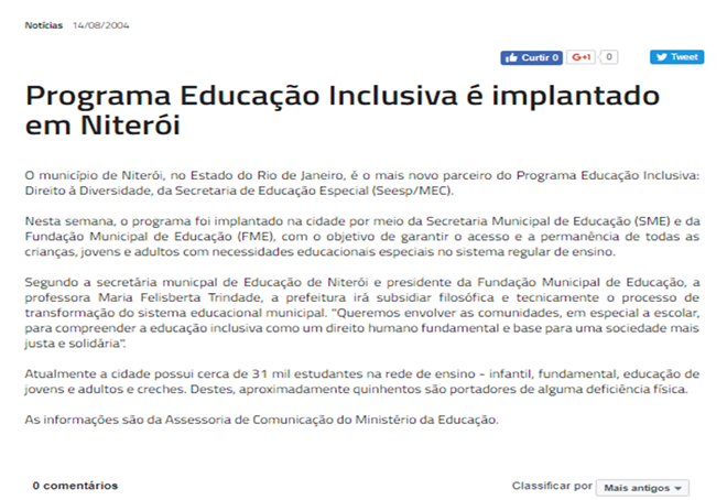 De acordo com as informações coletadas na entrevista que realizamos com a Professora Doutora Nelma Pintor[2], contidas também em documentos internos disponibilizados pela Assessoria de Educação Especial da FME, o Atendimento Educacional Especializado, organizado por meio da Sala de Recursos, foi instituído pela Coordenação de Educação Especial, em uma escola regular do município de Niterói, pela primeira vez no ano de 2000, antes do Programa de Implantação de Salas de Recursos Multifuncionais, lançado pelo Governo Federal, em abril de 2007, com a Portaria Normativa nº 13, conforme afirma professora doutora Nelma Pintor em entrevista a esta pesquisa: