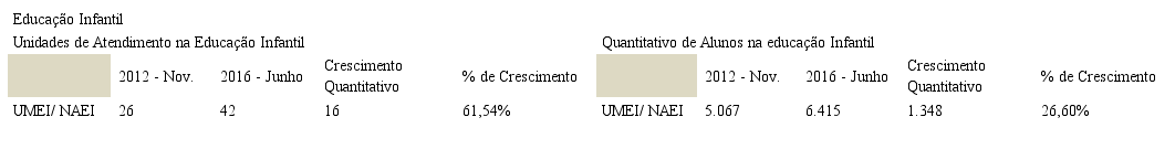 Outro importante movimento em direção à ampliação da educação infantil na perspectiva inclusiva em Niterói foi o lançamento, no ano de 2013, do programa Mais Infância. A iniciativa municipal viabilizada pelo programa Brasil Carinhoso, lançado pelo FNDE/MEC em 2012, que objetiva transferir automaticamente recursos financeiros para os municípios custearem despesas com manutenção e desenvolvimento da educação infantil, contribuiu com a ampliação do acesso e a permanência da criança com e sem deficiência na educação infantil, conforme mostra o quadro apresentado no III CONEDU pela Superintendência de Ensino da Fundação Municipal de Educação de Niterói, anexado a seguir: