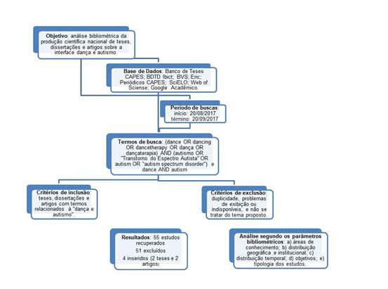 O presente estudo teve como objetivo geral: realizar uma análise bibliométrica da produção científica nacional de teses, dissertações e artigos sobre a interface dança e autismo. E, como objetivos específicos: i) identificar, sistematizar e delinear um perfil da respectiva produção de acordo com os seguintes parâmetros bibliométricos: áreas de conhecimento, distribuição geográfica e institucional, distribuição temporal, objetivos e tipologia dos estudos; ii) analisar criticamente a produção em questão para construção de indicadores.