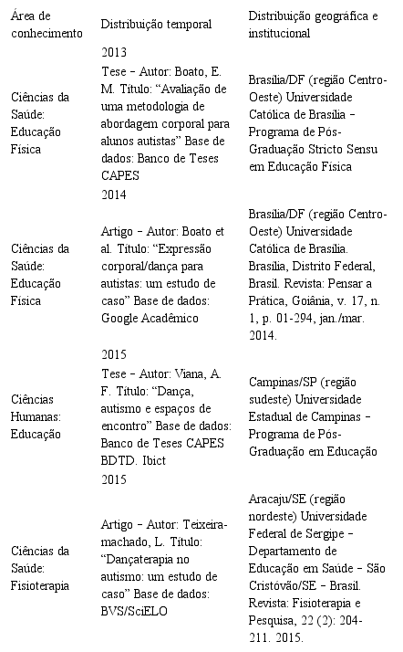Estes estudos estão distribuídos entre as regiões centro-oeste (educação física), sudeste (campo da educação) e nordeste (fisioterapia entrelaçada à dançaterapia), vinculados a instituições de ensino superior, sendo uma particular, uma estadual e uma federal. Estes dados denunciam uma defasagem de pesquisas nacionais que explorem os recursos da dança no desenvolvimento de pessoas com autismo. Uma questão a ser levantada é que possivelmente haja outros estudos não vinculados às bases de dados investigadas pelo presente estudo. Mas, há de se refletir sobre os resultados do estudo de Rossi e Munster (2013) que ressaltou a tendência dos estudos sobre dança com enfoque na deficiência física, ou seja, dança para cadeirantes, indicando a necessidades de outros estudos que pudessem abranger outras populações.