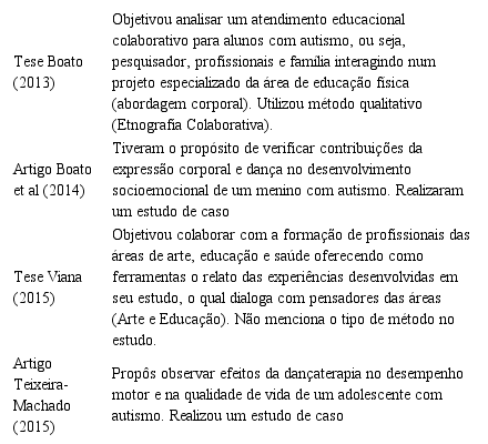 Com outro olhar, Viana (2015) teve o intuito de estimular uma compreensão da interface dança e autismo relacionada a teorias artísticas e pedagógicas. Já, no estudo de Teixeira-Machado (2015) houve uma tendência terapêutica corporal na qual a dança funcionou como elemento de reabilitação.