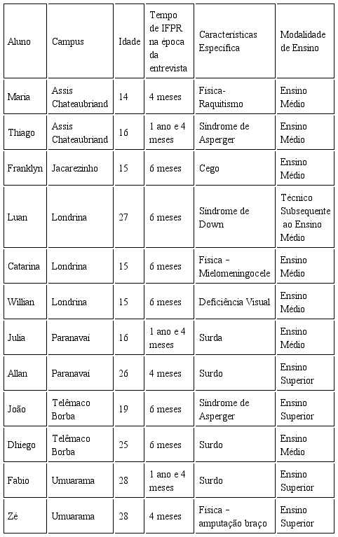 Definimos que, para participar do estudo, os alunos deveriam: a) ser considerados PAEE como indicado na Política Nacional de Educação Especial na Perspectiva da Educação Inclusiva (BRASIL, 2008); b) estar estudando no IFPR; c) ter recebido avaliação de “crescer bem” pelos professores; d) aceitar e assinar o termo de consentimento livre e esclarecido (TCLE) dos participantes maiores de idade e dos pais ou responsáveis no caso dos alunos menores de idade (estes também deveriam assinar o Termo de Assentimento); e) estar na faixa etária de 14 a 29 anos, independente do sexo, por se tratar de adolescentes matriculados no Ensino Médio, como também por se tratar de jovens matriculados no Ensino Superior. Ressaltamos que a Política Nacional da Juventude (PNJ) considera como jovens as pessoas com até 29 anos.