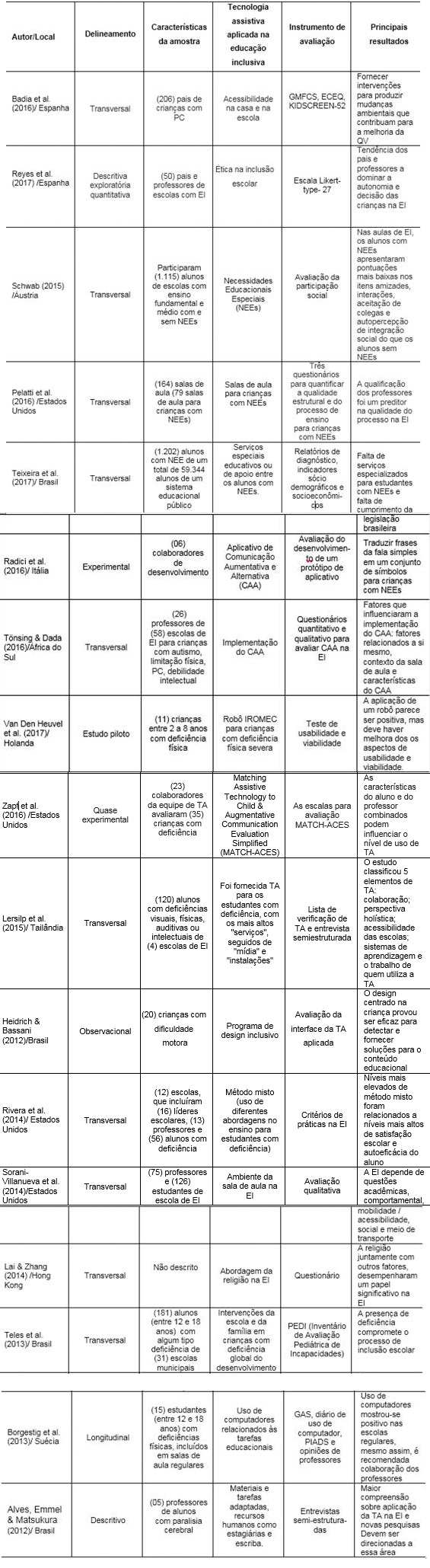 Após revisão dos 17 artigos possibilitou a análise de pesquisas no âmbito nacional e internacional. Participaram da análise 2881 alunos com NEEs entre 2 a 18 anos de idade, 391 pais e professores e 29 colaboradores da equipe de TA. A maior parte dos estudos apresentaram delineamento transversal, não foi descrito nenhum ensaio clínico controlado randomizado. Houve uma diversidade de Tecnologia Assistiva aplicada na Educação Inclusiva abordada pelos artigos revisados, tais como: acessibilidade na casa e na escola, ética na inclusão escolar, serviços especiais educativos ou de apoio, aplicativo de comunicação aumentativa, robô para crianças com deficiência física severa, programa de design inclusivo, uso de computadores, materiais e tarefas adaptadas.