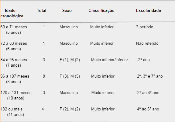 Com base na tabela, a faixa etária incluiu crianças de 5, 6, 7, 8, 10 e 11 anos. O nível de desenvolvimento motor apresentado foi inferior e muito inferior. O grau de escolaridade variou do segundo período do ensino infantil ao sétimo ano do ensino fundamental. O desempenho motor não diferiu em relação à escolaridade das crianças avaliadas, podendo ser observado que o desenvolvimento motor classificado como muito inferior, por exemplo, foi verificado em crianças do segundo ao sétimo ano. Assim, é possível identificar que as crianças apresentaram déficits motores significativos, independente da idade ou grau de escolaridade.
