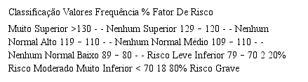 Para a análise dos resultados, os dados motores foram tabulados em meses e analisados com base na EDM. Observou-se que 80% da amostra obteve classificação “muito inferior”, com quociente motor menor que 70, demonstrando fator de risco grave para o desenvolvimento motor; 20% das crianças foram classificadas na categoria “Inferior”, apresentando um fator de risco moderado para o desenvolvimento, de acordo com a Tabela 2. Os fatores de risco representam o valor do impacto para o desenvolvimento.