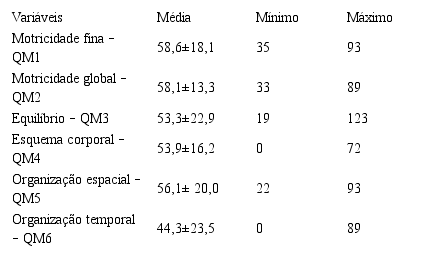A tabela 3 apresenta o resultado da avaliação motora em cada uma das variáveis. Verifica-se que a idade cronológica média foi de 106,7 meses, idade motora geral de 53,4 meses e quociente motor geral de 59,0 meses. Observa-se um atraso motor médio de 49,3 meses, determinado pela diferença entre a idade motora geral e a idade cronológica. Essa diferença não variou em relação ao sexo da criança. Das variáveis avaliadas, observa-se um atraso maior na área de linguagem/organização temporal, apresentando um quociente motor médio de 44,3.