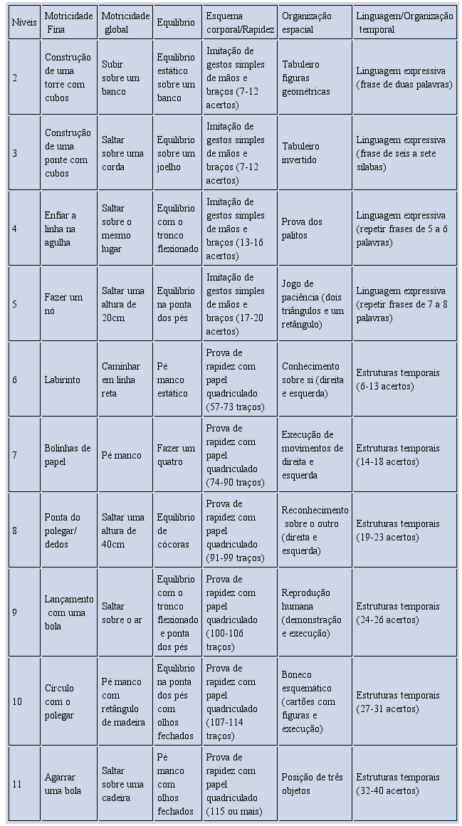 As noções temporais e espaciais estão intimamente ligadas à percepção corporal, sendo base para o desenvolvimento motor, cognitivo e social. Dessa forma, para que estejam desenvolvidas é necessária uma integração com a percepção corporal (FERNANDEZ, 2008). O presente estudo confirma essa teoria, uma vez que os maiores atrasos foram encontrados em esquema corporal e organização temporal e linguagem.