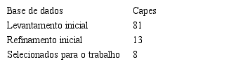 Na primeira fase desta etapa, levantamento inicial, foram identificados 81 artigos. Após as leituras de títulos, resumos e palavras-chave desses artigos, obteve-se, como resultado, 13 artigos classificados como pertinentes. Em seguida, realizaram-se o exame dos conteúdos dos artigos selecionados e os respectivos fichamentos. Na sequência, ao final da apreciação pormenorizada desses artigos, oito pesquisas foram selecionadas para a realização do estudo da primeira etapa, conforme apresentado na Tabela 1.