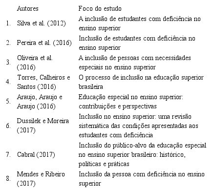 Oliveira et al. (2016), por sua vez, constataram que a educação inclusiva em relação às pessoas adultas recebe pouca atenção dos pesquisadores e que os trabalhos atualmente realizados são voltados mais para a assistência em saúde e muito pouco para a educação inclusiva. Desse modo, sugerem verificar se as Instituições de Ensino Superior (IES) estão preparadas para a inclusão de pessoas com necessidades especiais. Torres, Calheiros e Santos (2016) apontaram a escassez de trabalhos sobre inclusão no ensino superior; porém, com um crescente interesse a partir de 2014. Assim, indicaram a necessidade de identificar as principais dificuldades dos alunos com deficiência no ensino superior. Similarmente, Dussilek e Moreira (2017) relatam que, apesar de as políticas públicas assegurarem ao aluno com deficiência o direito ao acesso no ensino superior, existe um descompasso entre o que essas propostas anunciam e a realidade dos alunos, quanto à permanência e à conclusão da sua formação. Nesse sentido, eles sugerem explorar quais seriam essas dificuldades de promover a inclusão, bem como a conclusão da sua formação.