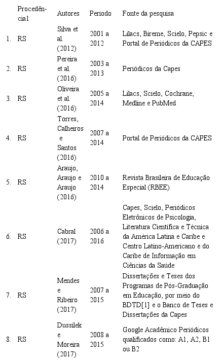 Conforme demonstrado no Quadro 2, não foram encontrados artigos com foco em Análise Bibliométrica (AB). Assim, todos os trabalhos selecionados foram classificados como de Revisão Sistemática. Essa ausência de trabalhos de AB chamou a atenção, pois, em pesquisas sobre pessoas com deficiência, a aplicação de análise bibliométrica está em franco crescimento (OLIVEIRA; MILL, 2016; FERREIRA et al., 2017). O período de busca aplicado pelos artigos selecionados abrangeu de 2001 até 2016. A fonte principal de busca foi o portal da CAPES. Contudo, três trabalhos utilizaram bases da área de ciências da saúde: Silva et al. (2012), Oliveira et al. (2016) e Cabral (2017). Essa ampliação de base pode ser produtiva, pois dois desses trabalhos têm a atuação dos autores na área de saúde. Mendes e Ribeiro (2017) utilizaram a fonte de pesquisa mais restrita, com foco em dissertações e teses, refinada para a área de educação; ao passo que Cabral (2017), apesar da formação na área de educação, utilizou o maior número de bases, inclusive as bases de saúde. Como demonstrado no Quadro 2: