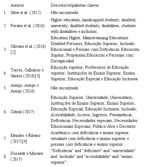 Por fim, Mendes e Ribeiro (2017) apontaram um aumento significativo no número de publicações e uma ampliação dos temas abordados em dissertações e teses, mas poucos estudos de abordagem quantitativa. A maioria das pesquisas que eles investigaram é ancorada pelo estudo de caso, pela entrevista na coleta de dados e pela análise de conteúdo como instrumento para o tratamento dessas informações. Eles propuseram, como sugestão de pesquisa, a realização de estudos que possam contribuir para os avanços, não apenas em termos da educação, mas acrescido da inclusão social das pessoas com deficiência a partir do ambiente universitário.