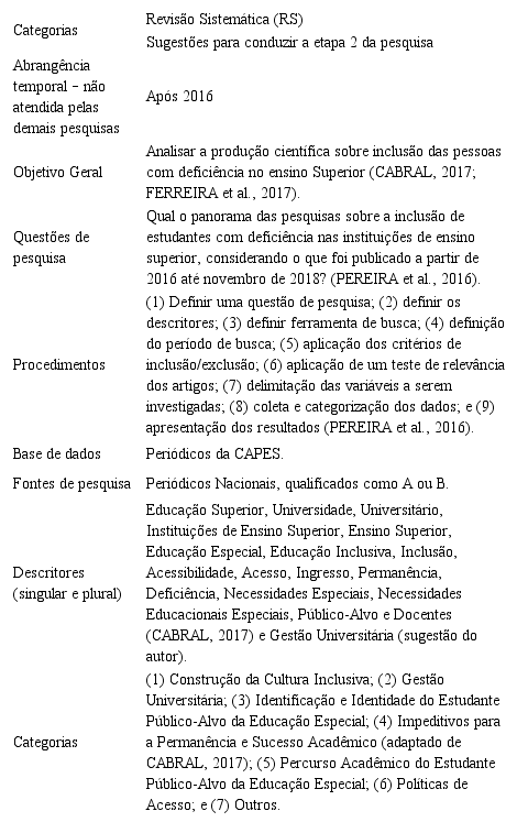 Na segunda, refinamento, foram feitas as leituras de títulos, resumos e palavras-chave dos resultados da fase 1 e a classificação dos artigos pertinentes aos propósitos desta etapa. O principal critério para apontamento como pertinente foi o vínculo com o ensino superior e pessoa com deficiência. Esta etapa ocorreu de outubro a novembro de 2018, quando se realizou uma Revisão Sistemática da literatura sobre deficientes e ensino superior, considerando as orientações constantes no Quadro 4 (mais adiante).