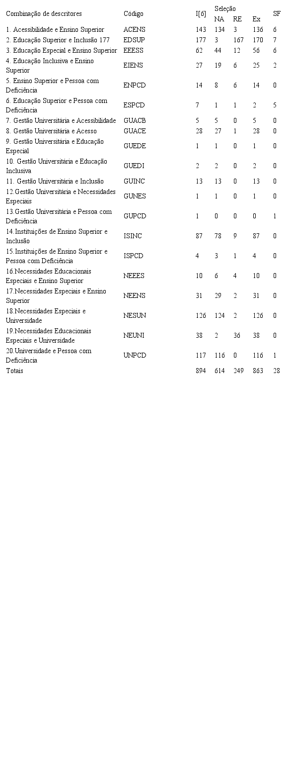 Para a condução desta etapa da pesquisa, de outubro a novembro de 2018, inicialmente preparam-se as combinações dos descritores e os seus respectivos códigos, conforme apresentado no Quadro 5. De posse dessa lista, iniciou-se a busca dos artigos relevantes, por meio do sítio periódicos da Capes, nas opções ‘busca avançada’, com o registro de busca conforme a combinação dos descritores, material apenas artigo, com o conector lógico “exato” e limitado pela data de início em 2016.