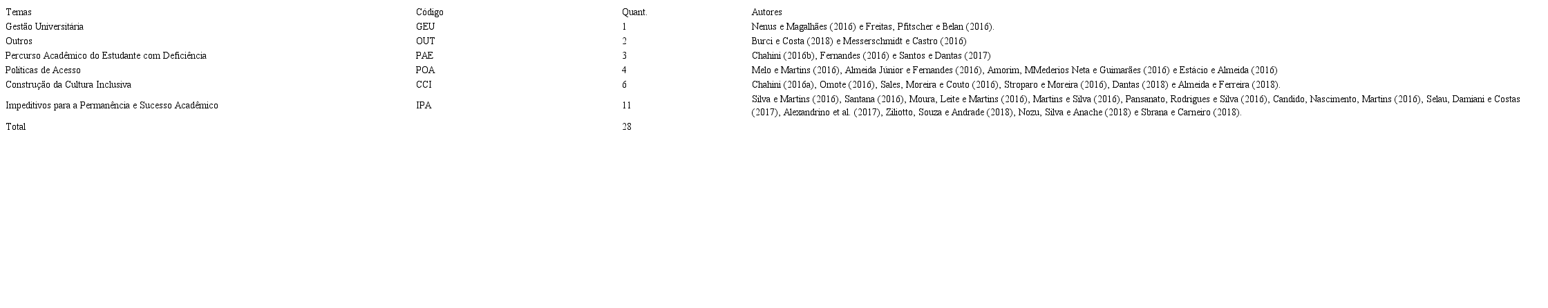 Ao finalizar essa etapa, ressalta-se que a quantidade de artigos selecionados, 28, é decorrente de um longo processo de escolha; assim, entende-se que esse resultado possibilita a discussão atualizada sobre o panorama das pesquisas sobre a inclusão de estudantes com deficiência em instituições de ensino superior, evidentemente considerando as limitações de pesquisa desta natureza. Contudo, a pequena quantidade de artigos selecionados em alguns temas demostra que o campo de estudo ensino superior é carente de pesquisas acadêmicas publicadas em periódicos.