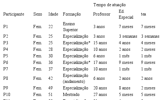 A Tabela 1 apresenta as características das 12 participantes, todas do sexo feminino. No tocante à formação, uma professora, apenas, possui ensino superior completo e as demais (n=11), especialização ou mestrado, sendo três em áreas relacionadas à educação especial ou inclusão escolar, além de duas professoras estagiárias do magistério não incluídas no estudo por terem idade inferior a 18 anos.
