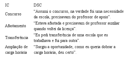 Em relação à forma da inserção dos professores como auxiliares de aluno autista, em dois casos a prefeitura indicou o profissional devido à falta de pessoal na escola, sendo duas estagiárias que estavam cursando o magistério. Nos demais casos, as professoras exerceram a atividade simplesmente pelo acaso de ser a vaga disponível no momento. Os DSCs do Quadro 1 ilustram a descrição das professoras de sua convocação a serem professoras auxiliares.
