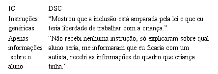 Quando questionadas acerca das instruções que receberam da direção ou da coordenação da escola sobre sua atuação como professor auxiliar, dois discursos puderam ser identificados: um apontando o caráter vago e com instruções genéricas e outro no qual eram apenas fornecidas informações referentes aos alunos que teriam de acompanhar (Quadro 02).