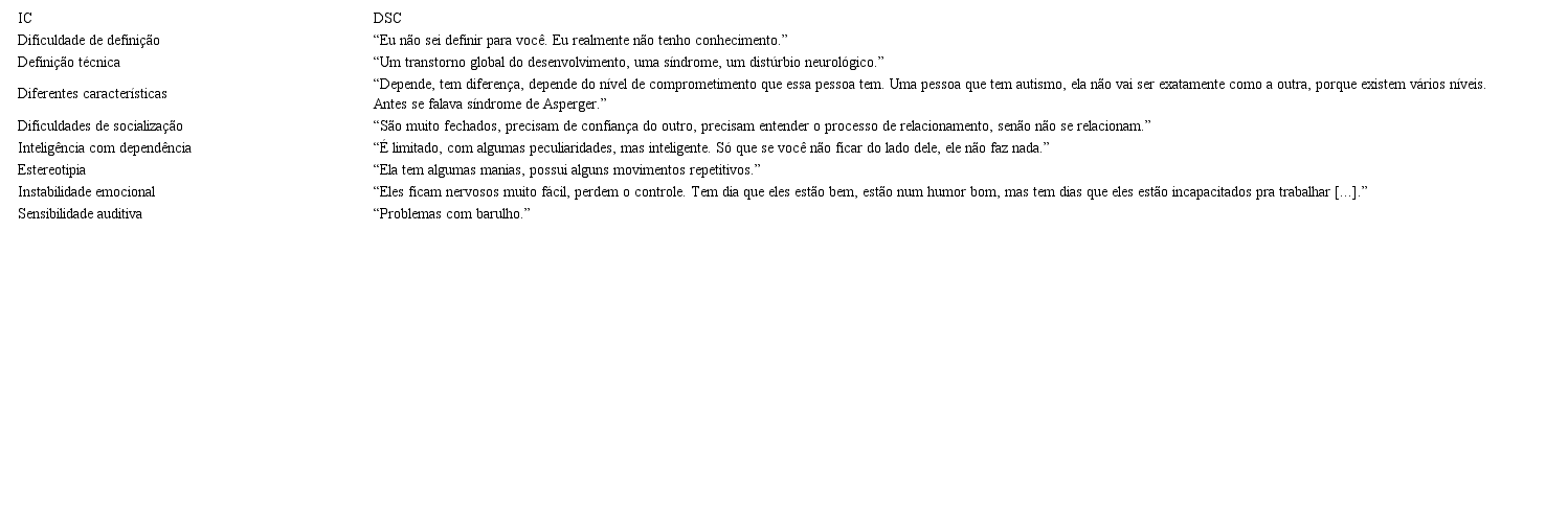 No Quadro 3, observa-se o conteúdo dos discursos das professoras quando questionadas sobre o que entendiam por autismo. Diferentes discursos foram identificados, desde dificuldades em estabelecer uma definição a definições derivadas de uma linguagem técnica.