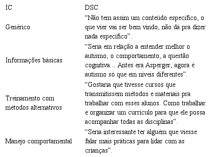 Em relação ao tipo de curso e conteúdos relacionados ao autismo que gostariam de ter acesso, os discursos variaram, desde professores que não souberam especificar o conteúdo ou que gostariam de informações básicas à solicitação de treinamento em métodos de ensino específicos e alternativos ou de manejo comportamental, conforme o disposto no Quadro 4.