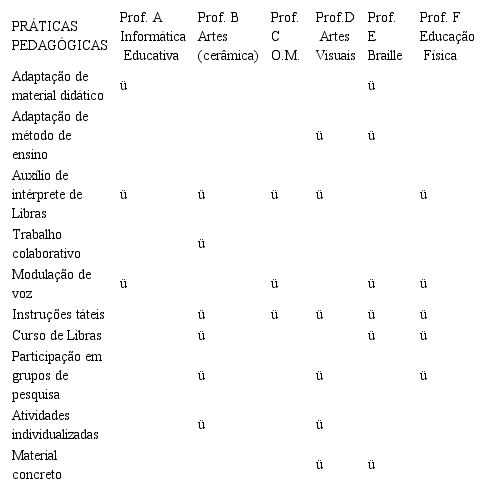 Foram convidados e aceitaram participar do estudo oito professores e um tradutor e intérprete de Libras. Em relação às práticas pedagógicas, foram analisadas as entrevistas de seis professores dos seguintes atendimentos: Orientação e Mobilidade, Artes (dois), Educação Física, Braille e Informática Educativa.