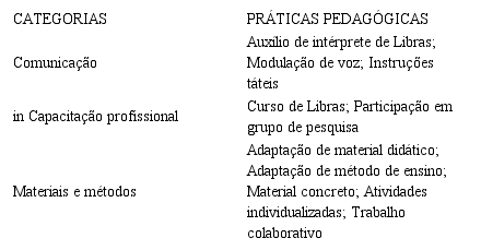 Ao selecionar o corpus da pesquisa foram identificadas as práticas pedagógicas mais recorrentes no atendimento dos discentes com surdocegueira. Posteriormente, as práticas foram classificadas em categorias de acordo com seus aspectos em comum. Conforme Bardin,