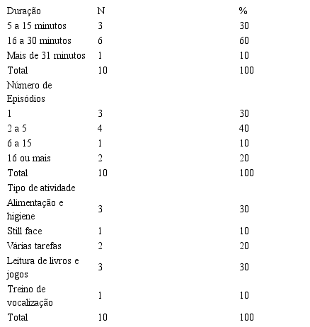 Considerando que a filmagem foi o procedimento mais frequente optamos por analisá-la com detalhe. A Tabela 8 mostra que a duração das filmagens mais utilizada foi de 16 a 30 minutos (60%), realizadas de dois a cinco episódios (40%) e os tipos de atividades mais frequentes foram alimentação, higiene e leitura de livros e jogos (ambos 30%).