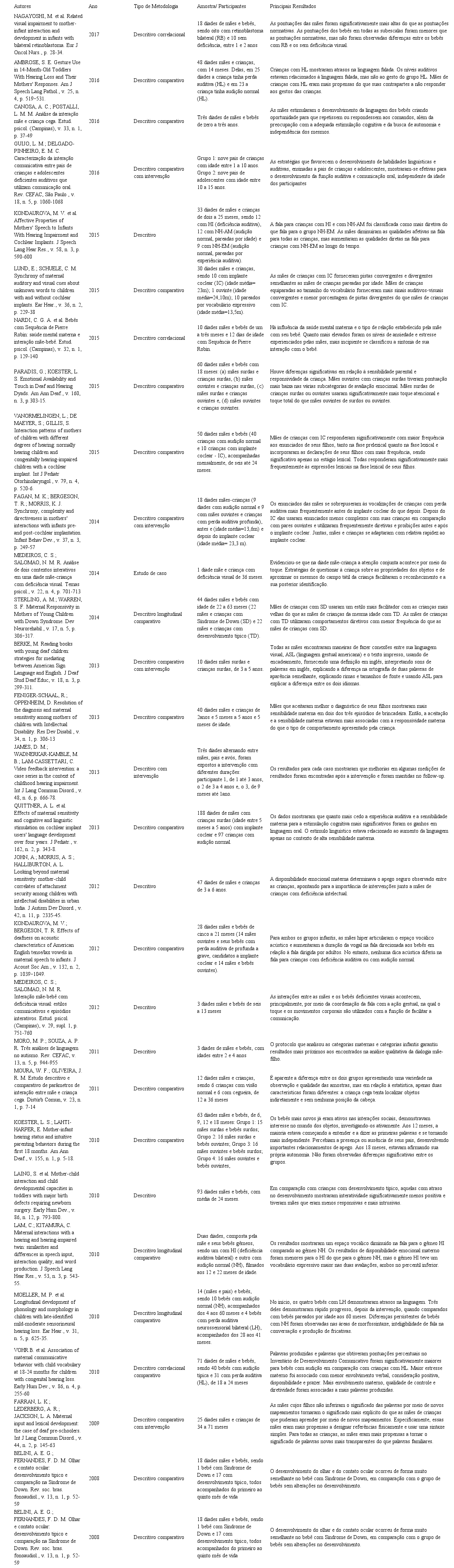 Quanto aos objetivos dos estudos optou-se por dividi-los de acordo com a deficiência. Nos estudos com crianças com deficiência auditiva implantadas o objetivo foi comparar díades com crianças implantadas e ouvintes. A Tabela 4 mostra que, nos estudos com crianças com deficiência auditiva sem implante, a maioria dos estudos encontrados (21,43%) analisaram especificamente o tipo de comunicação oral e visual tanto de mães como de pais com suas crianças. Foram realizados, também, estudos comparando díades de crianças surdas e ouvintes (14,28%) e, um estudo avaliou o efeito de uma intervenção sobre o comportamento de interação da mãe com sua criança com deficiência auditiva.