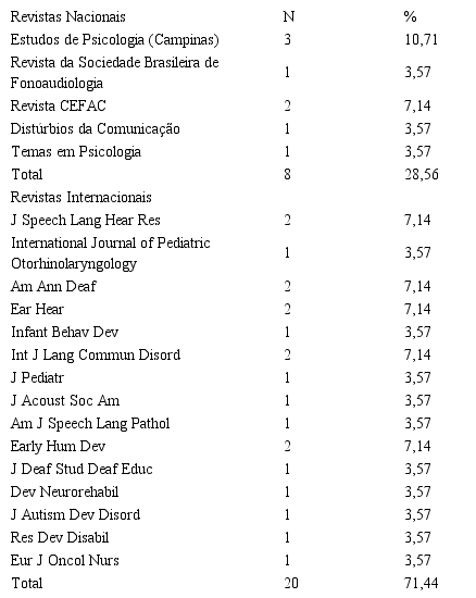 Com relação ao tipo de revista, a Tabela 2 mostra que, no Brasil, as publicações variaram igualmente em revistas de Fonoaudiologia e em Psicologia, mas, no exterior prevalereceram as revistas da área de Fonoaudiologia e, especificamente, em deficiência auditiva.