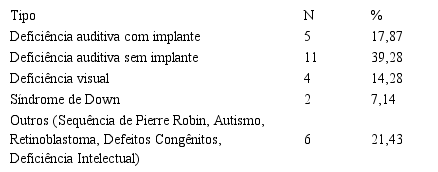 A Tabela 3 mostra os tipos de deficiências presentes nos artigos. Observa-se que a deficiência mais presente foi a deficiência auditiva presente em 57,15% dos estudos.