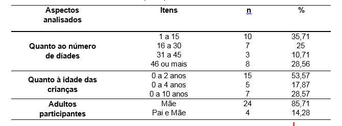 Quanto às características dos participantes das díades, analisou-se o número de díades, a idade da criança e se foi o pai ou a mãe o participante. De acordo com a Tabela 5, a maioria dos artigos tiveram de 1 a 15 díades (35,71%), crianças de 0 a 2 anos (53,57%) e as mães como participantes (85,71%).