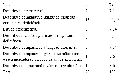 A Tabela 6 mostra os dados obtidos das análises do delineamento utilizado nos diferentes estudos. Prevaleceu estudos comparativos analisando a interação de crianças com e sem deficiência (46,38%) e, em seguida, estudos descritivos da interação da mãe com sua criança com deficiência.