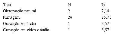 Quanto ao tipo de procedimento utilizado nos estudos analisados, observa-se, conforme mostra a Tabela 7, que o procedimento mais utilizado para avaliar a interação foi a filmagem (85,71%), seguido pela obervação natural (7,14%), gravação em áudio e gravação em vídeo e áudio (3,57%).