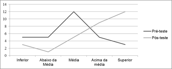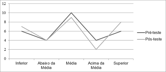 Por meio dos dados do Gráfico 1, nota-se que mais alunos com AH/SD pontuaram nos níveis inferior e superior no pós-teste. O número de resultados abaixo da média do grupo se manteve o mesmo, havendo, no entanto, menos resultados na média ou acima da média. Tais dados são diversos aos do grupo sem AH/SD, conforme representado no Gráfico 2.