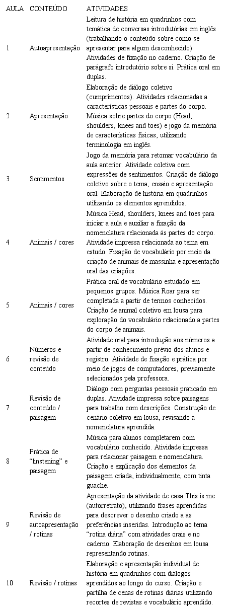 O grupo composto por doze crianças participou simultaneamente do programa de desenvolvimento da criatividade por meio de suplementação em língua inglesa, com encontros semanais de duas horas diárias, após o período de aulas regulares, durante o segundo semestre de 2015, compondo um total de dez encontros destinados às intervenções. Outros dois momentos destinaram-se à explicação do projeto aos alunos e seus familiares (antes do programa de intervenção) e dois à aplicação de testes, de forma coletiva, de língua inglesa e criatividade (antes e após o programa de intervenção), cujos dados serão apresentados neste estudo.
